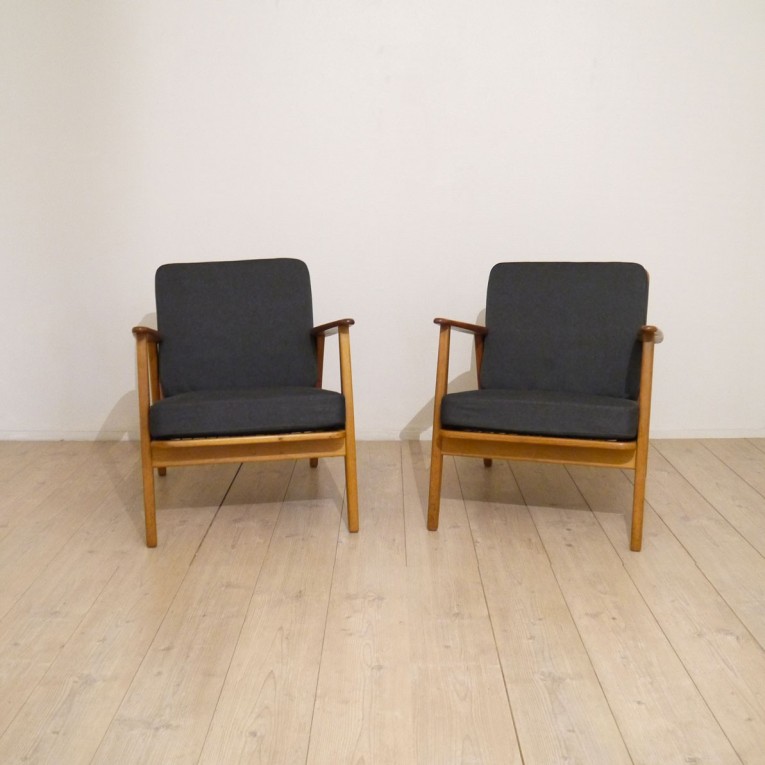 Fauteuils scandinaves 1960, fauteuils scandinaves structure en teck massif, dossier et assise déhoussables retapissés avec un tissu d'ameublement anthracite, fabriqués au Danemark dans les années 60, un modèle chic et design, très bon état, vendu par paire.