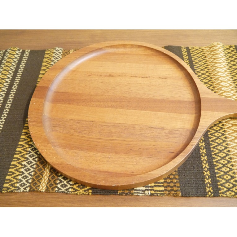 Plateau scandinave en teck, plateau de service en teck massif, jolie forme cylindrique et poignée avec petit lien pour accrocher, design danois vers 1970 par Kjeni (made in Denmark), un petit article vintage qui pourra s'utiliser de multiples façons, très bon état.