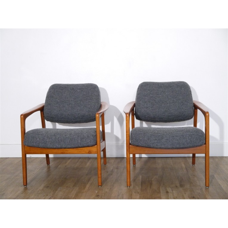 Paire de fauteuils scandinave en teck de Folke Ohlsson 1960, fauteuils vintage scandinave, structure en teck, tapisserie neuve mousses et tissu, laine bouillie coloris gris, fabrication et design suedois de Folke Ohlsson pour Dux vers 1960, un classique du design scandinave, bon état