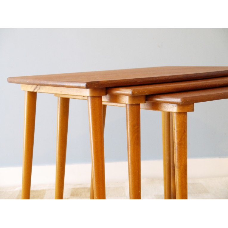 Table gigognes vintage scandinave, ensemble de 3 tables gigognes en teck, fabrication et design suédois vers 1960, éstampillé made in Sweden, jolie forme pour ces tables gigognes qui pourront etre disposées séparément ou réunies devant ou en bout de canapé, très bon état.