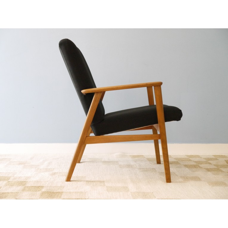 Fauteuils vintages scandinaves en chêne, paire de fauteuils scandinaves, structure en chêne, assise et dossier en tissu noir (refait à neuf), fabrication et design suédois environ vers 1960, un modèle bien dans l'esprit du design scandinave, sobre et confortable, très bon état.