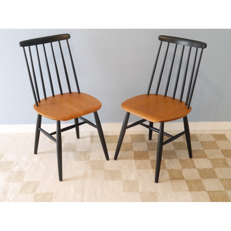 Paire de chaises scandinaves style fanett, chaises scandinaves à barreaux en bois, piétement et dossier laqués noir, assise en teck, design suédois des années 50, inspirée de la célèbre chaise fanett de Tapiovaara, un modèle vraiment tendance, très bon état.