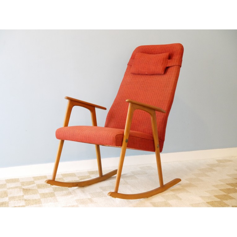 Rocking chair vintage scandinave 1950, rocking chair en hêtre, beau travail sur la lignes des accoudoirs, assise et dossier en tissu chiné rouge, design suédois des années 50, une pièce originale, parfaite pour la déco d'un salon, bon état.
