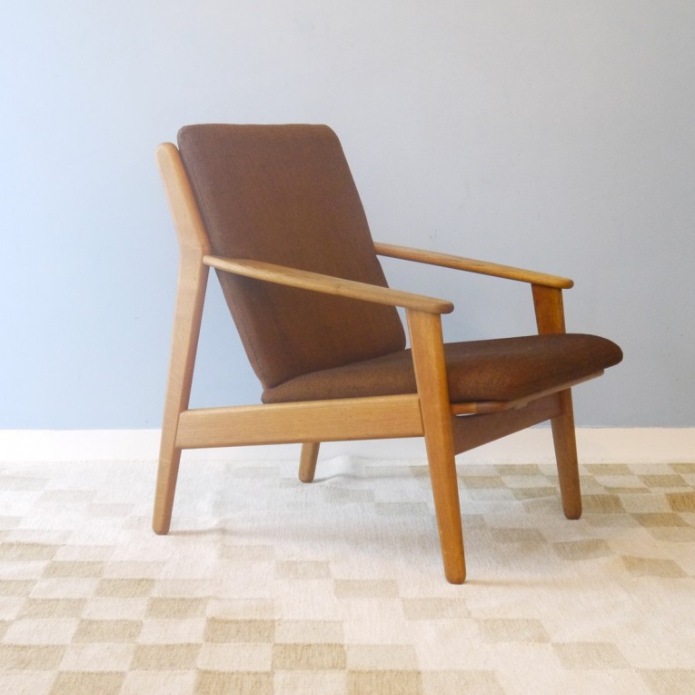 Fauteuil design scandinave en chêne 1960, fauteuil danois en chêne massif, assise et dossier marron chiné, design de Poul Volther pour FDB vers 1960 (modèle J55) estampillé Made in denmark, des lignes sobres, un modèle cosy et élégant pour une déco très tendance, très bon état.