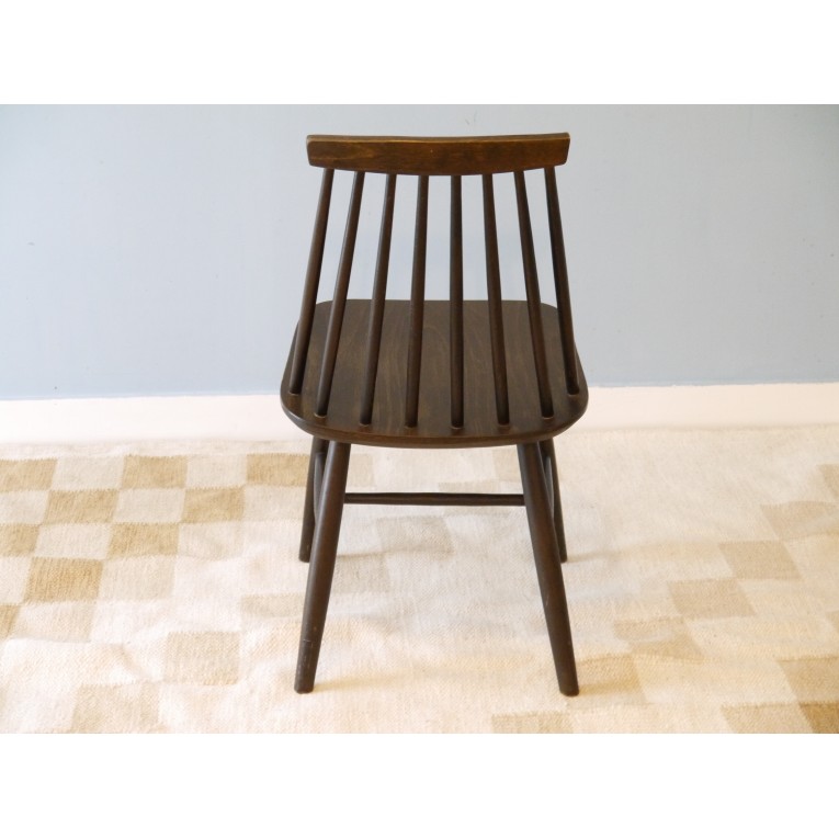 Chaise vintage en bois, chaise scandinave à barreaux, structure en bois (plywood) teinté marron, forme proche de la Fanett de Tapiovaara, fabrication et design suédois des années 60, jolie chaise très tendance à marier avec d'autres chaises pour une déco dépareillée, très bon état.