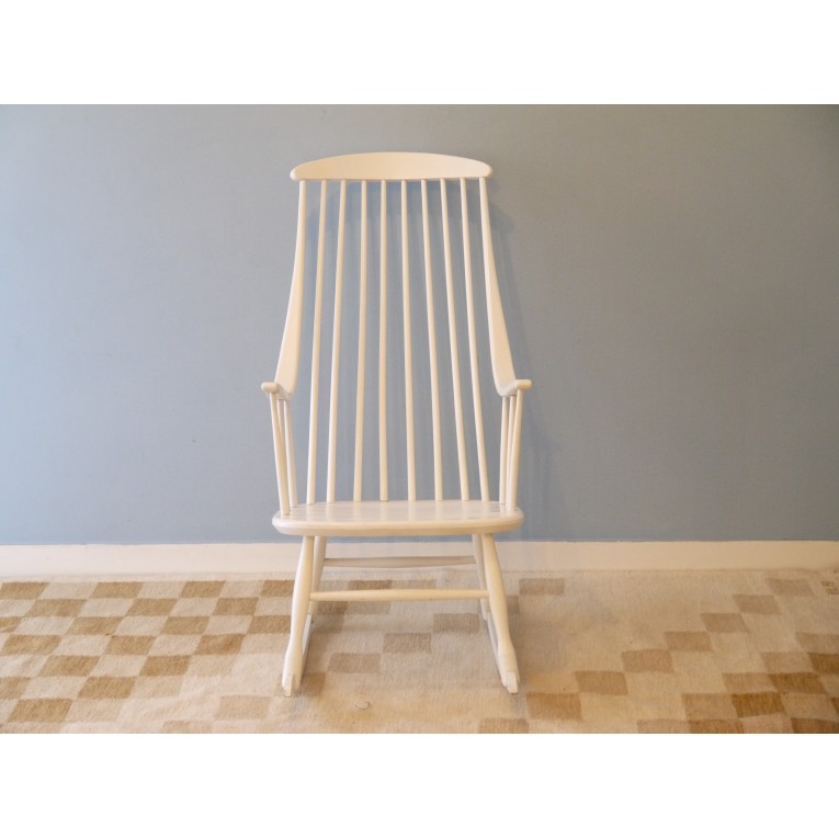 Rocking chair scandinave Lena Larsson, rocking chair à barreaux vintage, structure en bois laqué blanc, design suédois de Lena Larsson, modèle bohem, pour Nassjo Mobelfabrik, 1958, très jolie forme pour ce rocking chair qui nous évoque le travail de Tapiovaara, une pièce vraiment tendance, très bon état