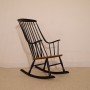 Rocking chair design scandinave Lena Larsson, Rocking chair vintage structure en hêtre laqué noir, assise en bois massif, design scandinave de Lena Larsson modèle "Bohem" pour Nassjo Mobelfabrik/Nesto dans les années 60, estampillé sous l'assise, un design intemporel pour ce rocking chair qui rappelle les creations de Tapiovaara, bon état, traces sur l'assise et très légère déformation du dossier, voir photos.