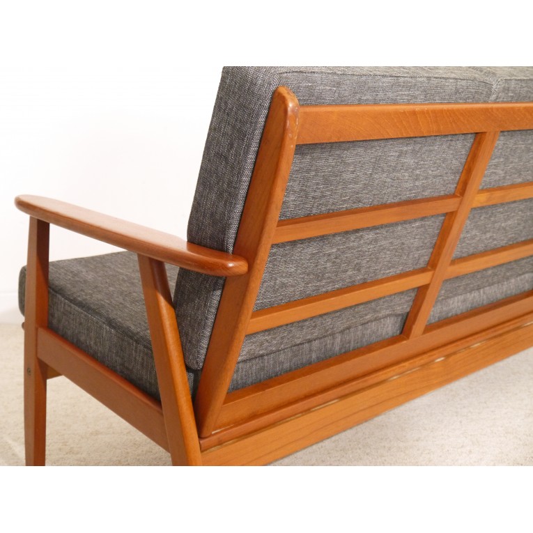 Canapé vintage scandinave 1960, canapé vintage scandinave, structure en teck, coussins assises et dossier neufs (mousses et tapisserie) tissu d'ameublement gris chiné, fabrication et design danois vers 1960, parfait pour une déco design ou moderniste, très bon état.