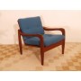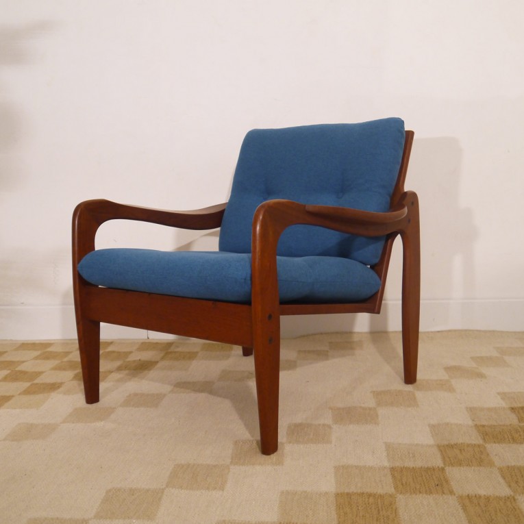 Fauteuil vintage danois 1960 bleu, fauteuil vintage scandinave structure en teck massif, coussins retapissés tissu d(ameublement bleu, fabrication et design danois des années 60, un fauteuil élégant et confortable pour décorer dans toutes les pièces de la maison, très bon état.