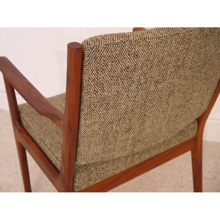 Fauteuil vintage scandinave design de K.E Ekselius, fauteuil vintage structure en teck massif, assise et dossier retapissés tissu vert chiné, mousses neuves, design suèdois des années 60 de Karl Erik Ekselius pour Joc vetlenda, joli fauteuil, confortable et peu encombrant, très bon état.