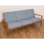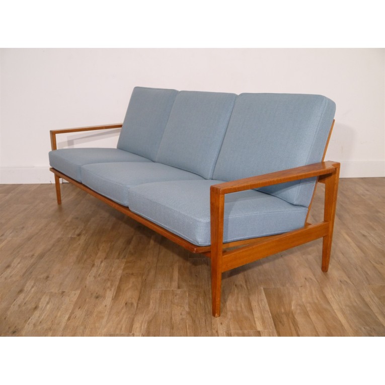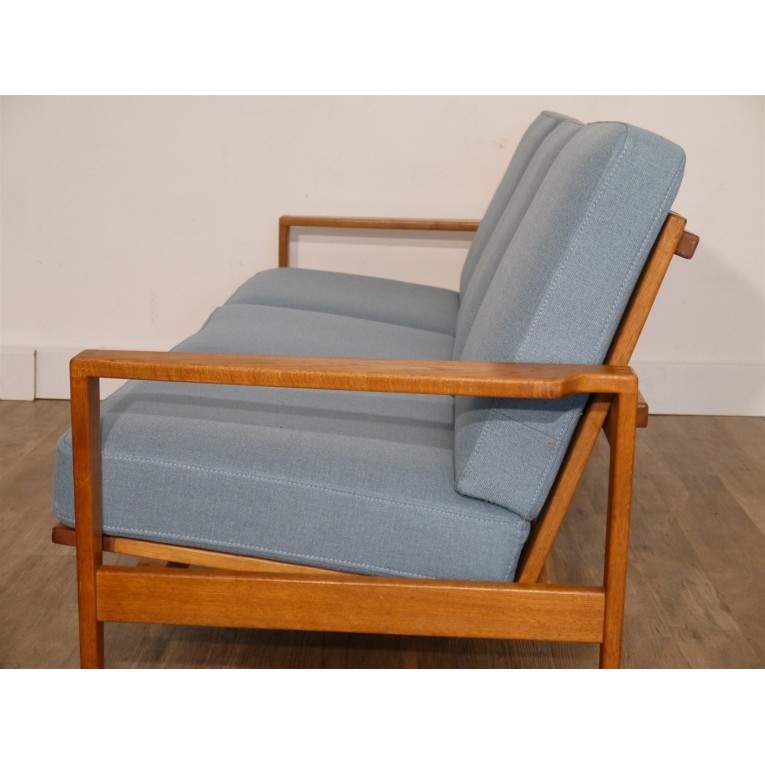 canapé vintage scandinave Erick Wortz en chene, canapé vintage scandinave structure en chene massif, coussin retapissés tissu d'ameublement bleu, fabrication et design danois d'Erick Wortz dans les années 60, un canapé vintage idéal pour la déco d'un salon, très bon état, traces d'usages.