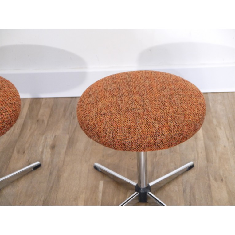 Paire de Tabourets vintage 1970, tabourets vintage piétement en chrome, assise tissu orange chiné refaite à neuf, fabrication et design scandinave des années 1970, jolis tabourets vintage pour decorer dans toutes les pièces de la maison, très bon état