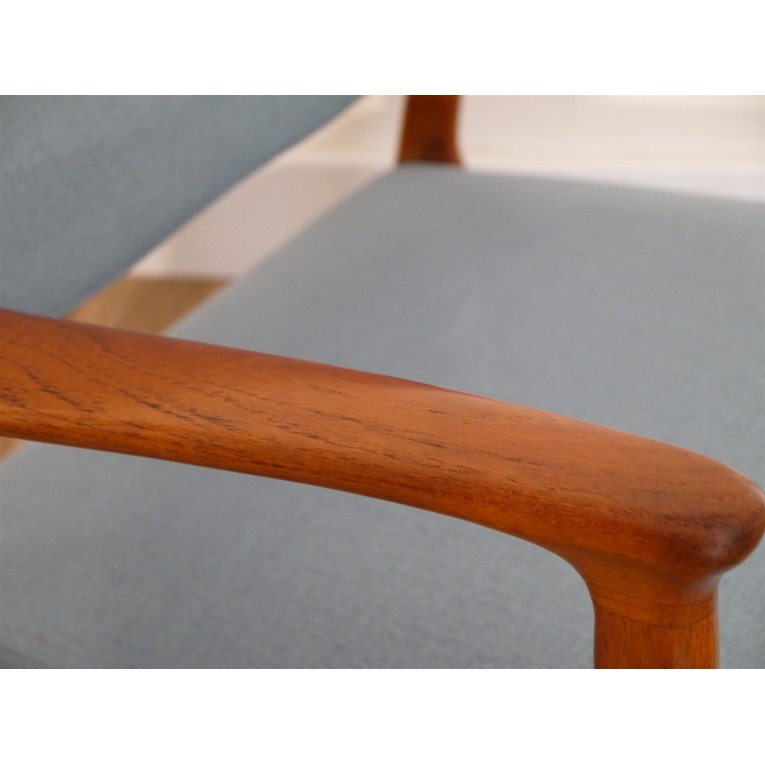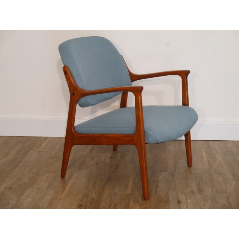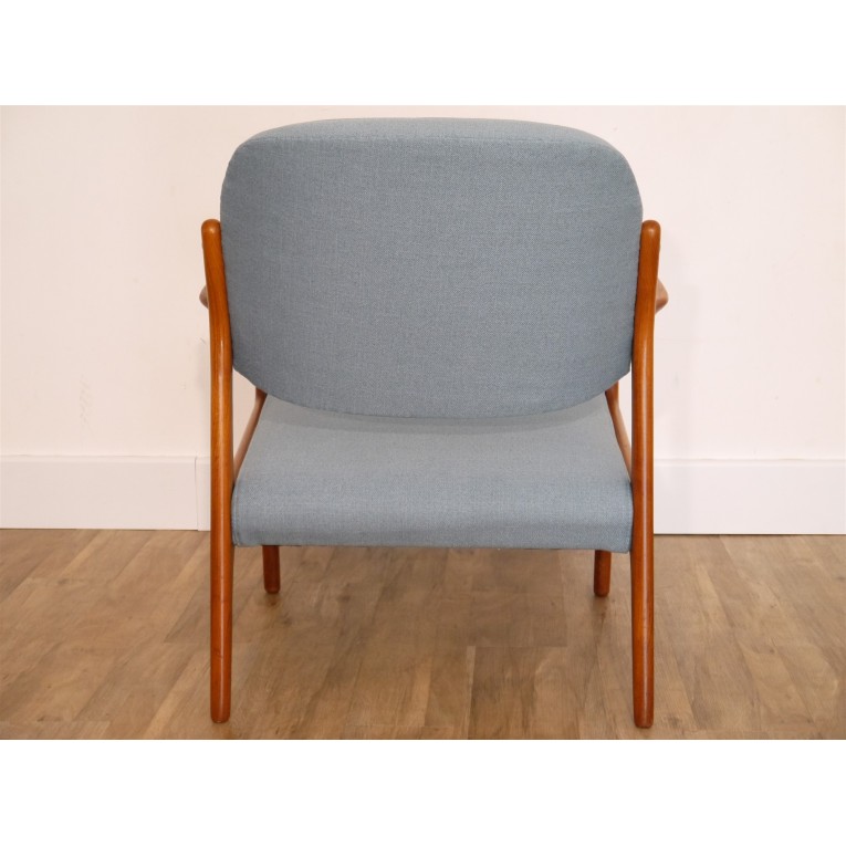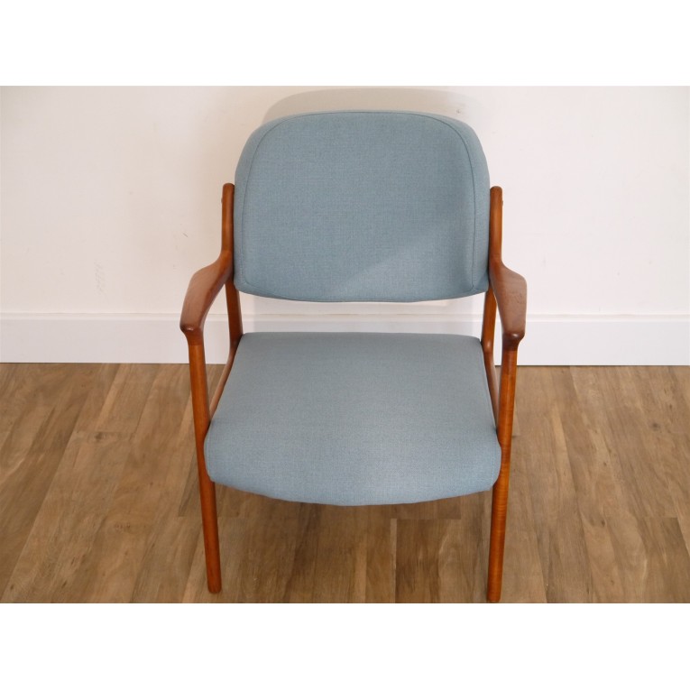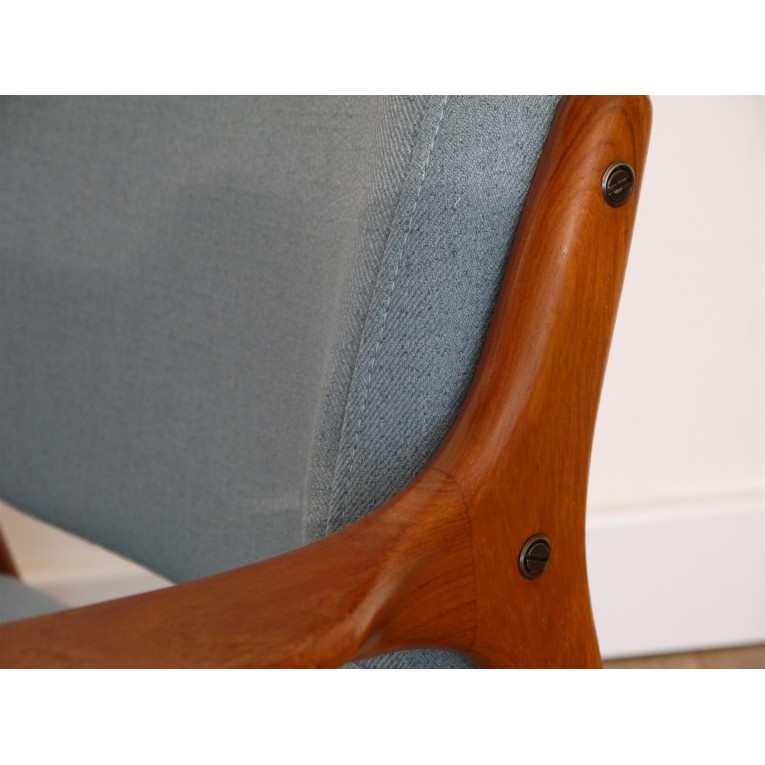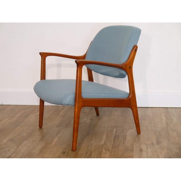 Fauteuil vintage scandinave en teck design Inge Andersson, fauteuil vintage scandinave, structure en teck, assise et dossier retapissés tissu d'ameublement bleu, mousses neuves, fabrication et design suédois de Inge Andersson modèle Domus, joli fauteuil vintage pour une déco très tendance, très bon état.