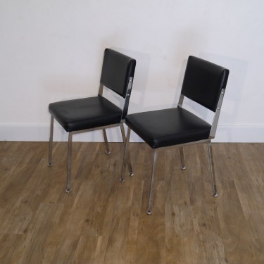 Paire de chaises vintage 1970 metal et skai, chaises vintage structure metallique, assise et dossier en skai noir, fabrication et design francais des années 1970, jolies chaises vintage pour decorer dans toutes les pièces de la maison, bon état, traces d'usages et defauts mineurs.