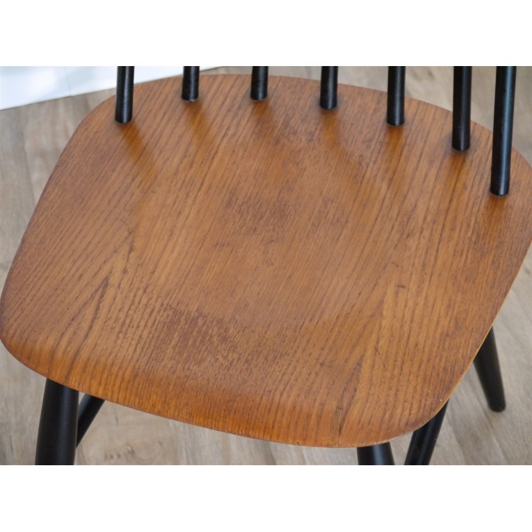 Paire de chaises Fanett par Ilmari Tapiovaara, chaises vintage scandinave structure en bois laqué noir assise en teck, fabrication et design scandinave par Ilmari Tapiovaara pour Edsbyverken, jolies chaises vintage, modèle emblematique du design scandinave, bon état, traces d'usages.