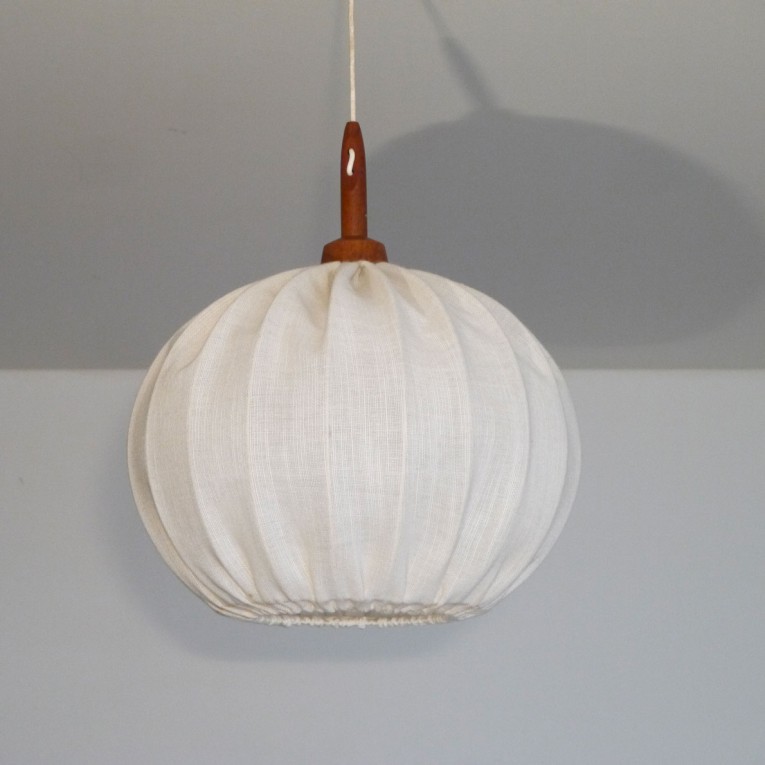 Suspension "Ballon" scandinave en teck et tissu, suspension vintage scandinave en teck, verre et abat jour en tissu beige, éléctricité téstée, fabrication et design suédois des annéess 1960, un luminaire vintage très decoratif à utiliser dans toutes les pièces de la maison, bon état, traces d'usages.